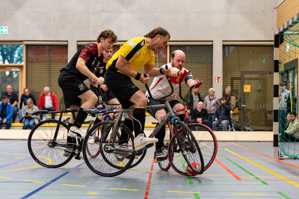 Micha Treutner war am Samstag übrigens noch bei einem weiteren Termin, bei dem ich vorher auch war. Handball? Nein. Einen Bezug gibt es aber doch. Denn Fünfer-Radball, was noch exotischer ist als das „normale“ Zweier-Radball, wird auf dem Handball-Feld und auch auf Handball-Tore gespielt. Das ist wirklich spannend, gut anzusehen und zwei Teams aus der Region spielen in der Bundesliga, die diesmal in Reichenbach Station gemacht hat.